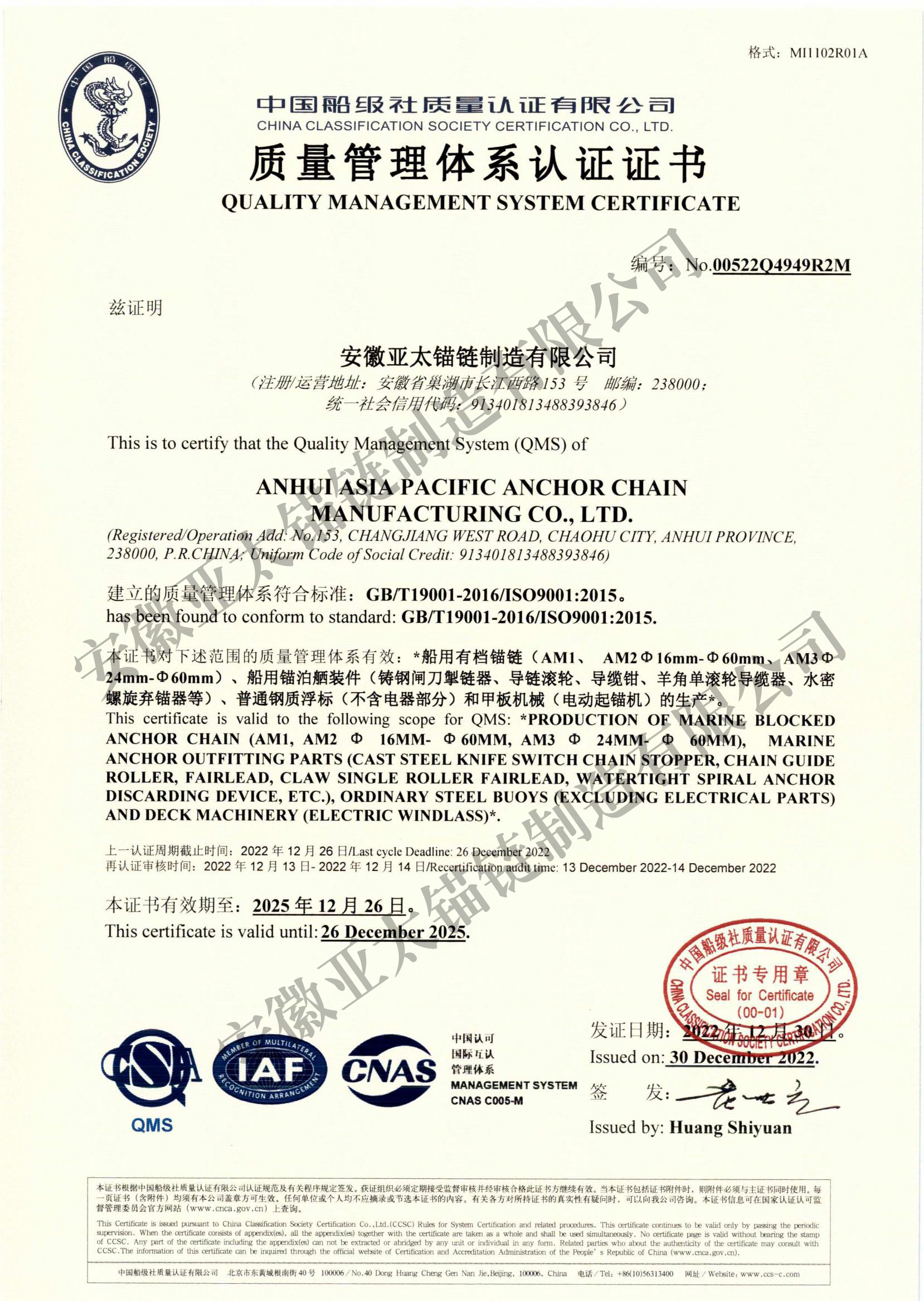 安徽亞太錨鏈制造有限公司是國家高新技術企業,也是國家GB/T 549-2017《電焊錨鏈》標準的起草和制定單位之一。公司旗下設有錨鏈分廠、浮標分廠、舾裝件分廠等多個分廠。公司專業從事φ12.5mm-φ107mm二、三級船用錨鏈、浮標錨鏈、錨鏈附件,錨、船舶曬裝產品、航標、系船浮、船型標、多種規格海洋監測浮標及航標燈等產品的生產、安裝和服務。目前公司的產品銷往全國各地船廠、碼頭、航標處、航道局、海洋局,并已走上國際市場,如東南亞、中東、歐美等國家。